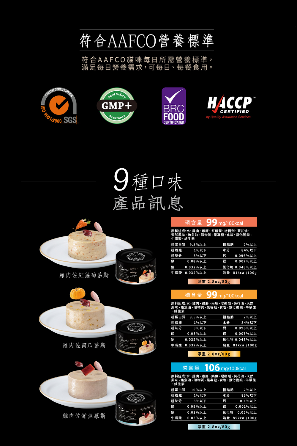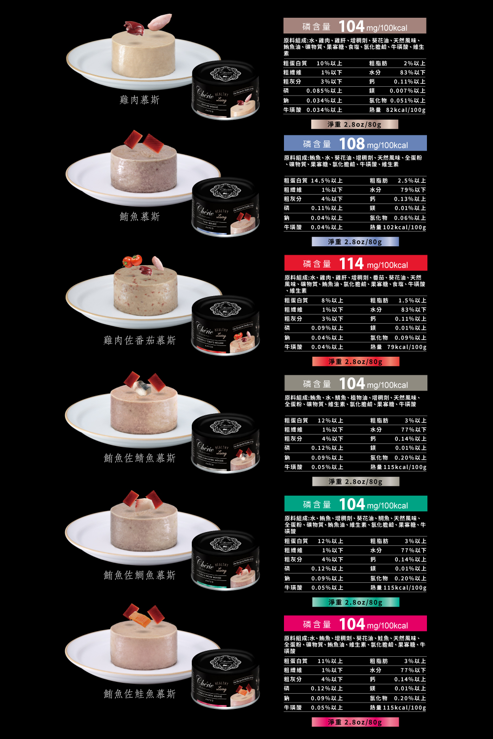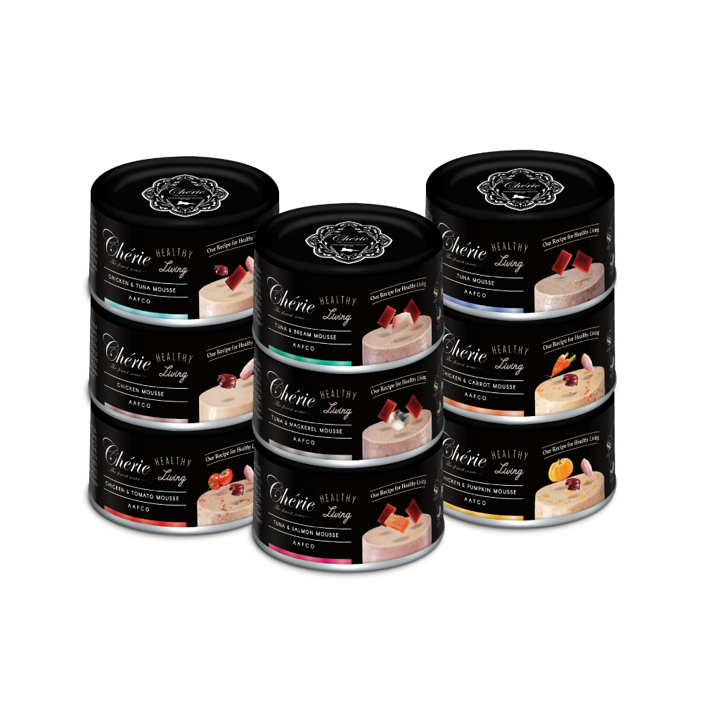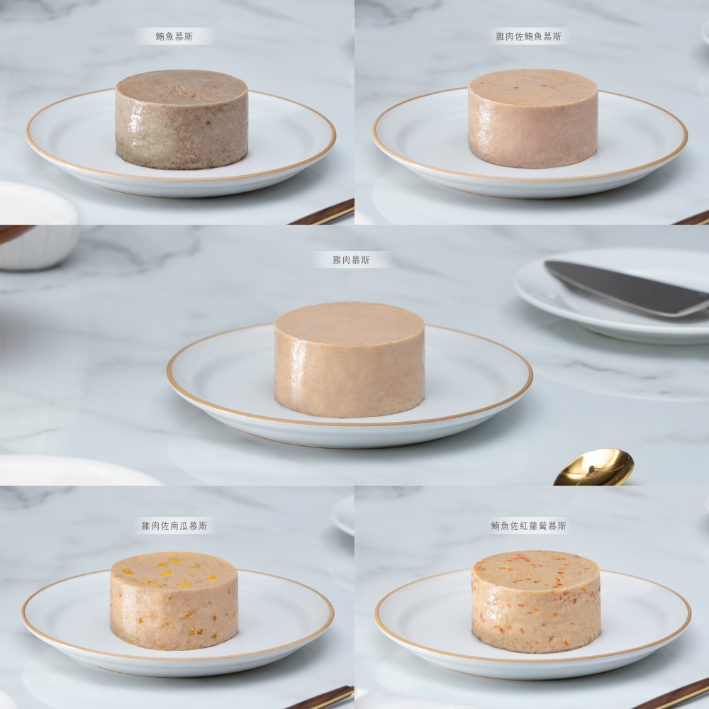 系列6種口味: 鮪魚慕斯 雞肉佐鮪魚慕斯 雞肉慕斯 雞肉佐南瓜慕斯 雞肉佐紅蘿蔔慕斯 鮪魚佐鯛魚慕斯 規格:80g 適用寵物種類:全齡貓 原產地:泰國 口味 鮪魚慕斯, 雞肉佐鮪魚慕斯, 雞肉慕斯, 雞肉佐南瓜慕斯, 雞肉佐紅蘿蔔慕斯, 鮪魚佐鯛魚慕斯